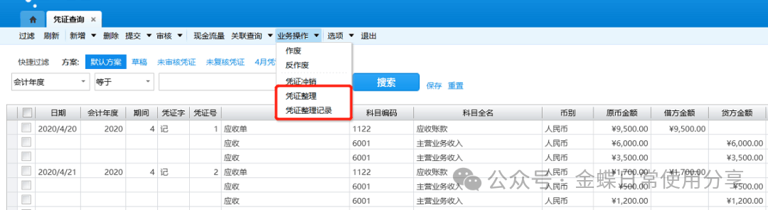 5.系统在凭证查询界面的工具栏提供凭证整理的功能,可将账簿内的凭证号码进行重新排列。该操作是不可撤消的,用户将凭证号码重新整理后,原来已经打印的凭证需要重新打印。所以进行此操作时要特别小心;
