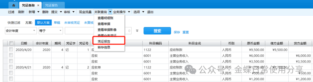 6.用户在凭证查询界面工具栏点击凭证报告按钮,系统可以提供凭证报告。首先选择账簿、期间范围以及凭证字及凭证号范围,然后查看凭证报告;