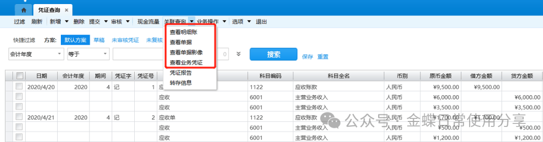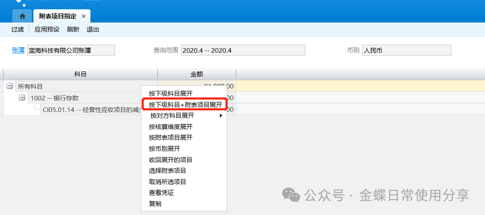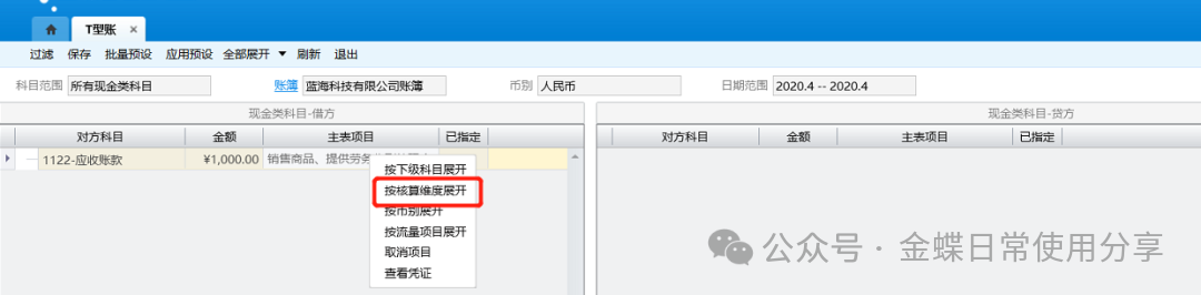 2.应用预设后可以点击右键在工具栏中选择以核算维度、币别、下级明细科目或者现金流量项目等多种方式展开,联查凭证,方便指定和查阅;