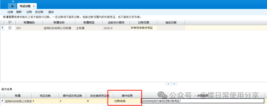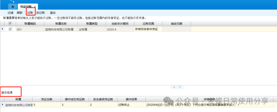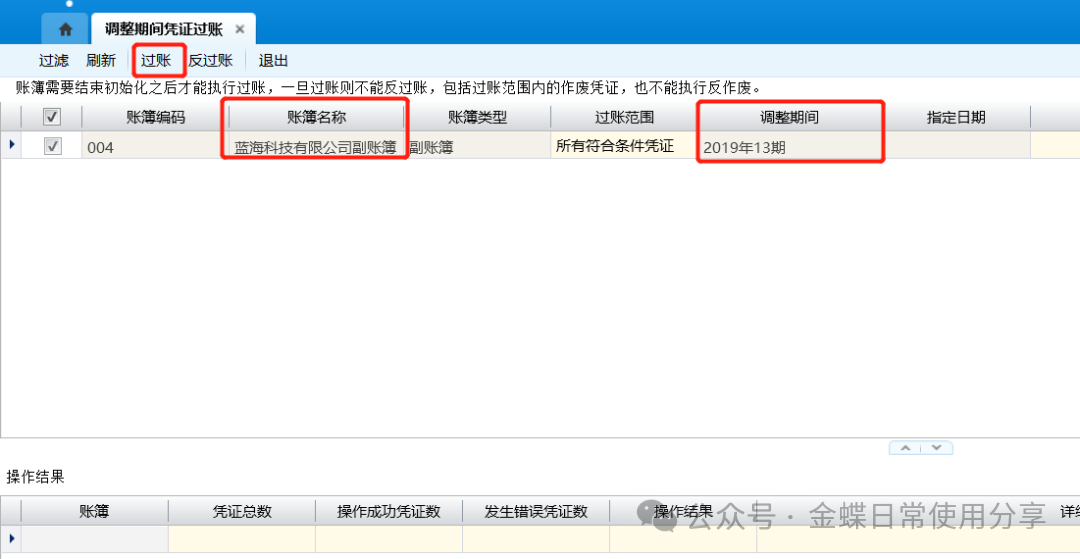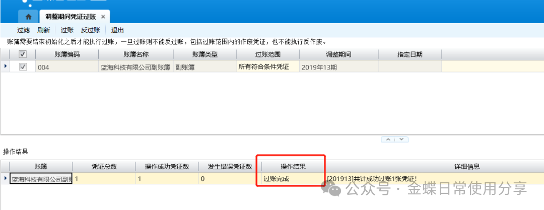8.4调整期间凭证过账【业务场景】:调整期间凭证过账用于更新过账调整期间的科目余额表(本期发生、本年累计及期末余额表),更新过账期间以后所有期间的科目余额表(期初、期末)以及更新过账期间以后当年其它调整期间的科目余额表(本年累计) 。 调整期间凭证过账界面不显示“当前会计期间”,显示“调整期间”列。 【用户角色】:总账会计 【功能菜单】:【财务会计】->【总账】->【调整期间业务处理】->【调整期间凭证过账】 【操作说明】: 1.选择相应的需要执行过账的账簿,点击【过账】;