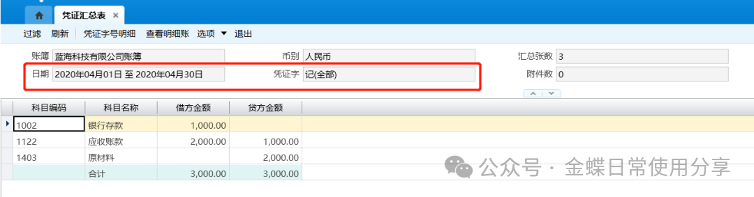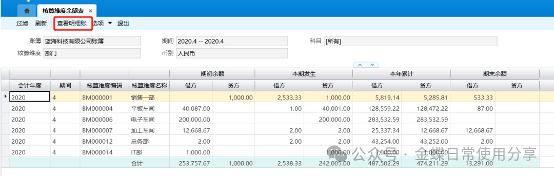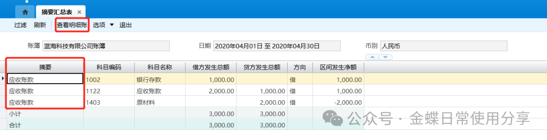 2.系统支持摘要汇总表联查明细分类账,用户选择需要联查的记录,点击工具栏的查看明细账按钮联查明细分类账信息;