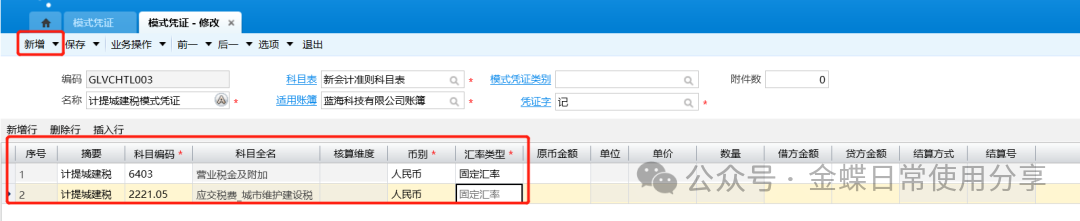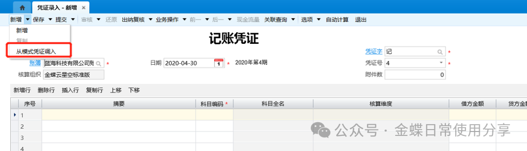2.凭证录入时,在新增操作中选择“从模式凭证调入”,在模式凭证列表选择对应的模式凭证;