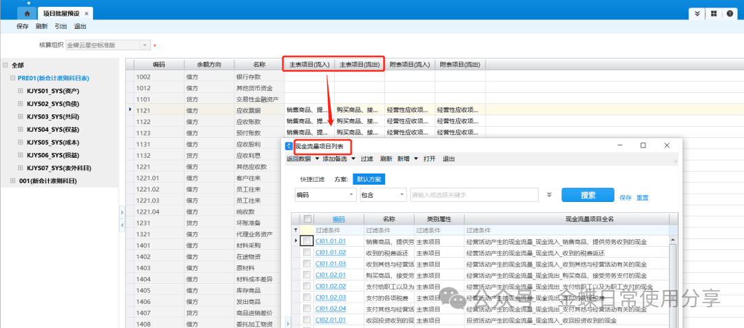 2.项目批量预设与科目属性的现金流量项目预设是一致的,在项目批量预设中设置后,可以在科目属性中查看对应的预设项目信息;