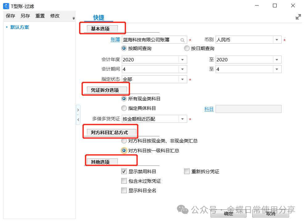 4.2T型账【业务场景】:使用T型账可以批量指定账簿一定范围内涉及现金流量业务的主表项目,且T型账可以处理账簿所有期间的数据,不论凭证是否过账、是否审核,也不论期间是否已结账,系统均可以对凭证进行拆分处理,用户指定完成后,即可编制现金流量报表。 【用户角色】:总账会计 【功能菜单】:【财务会计】->【总账】->【现金流量】->【T型账】 【操作说明】: 1.根据需要设置T型账的过滤方案,过滤条件说明如下;