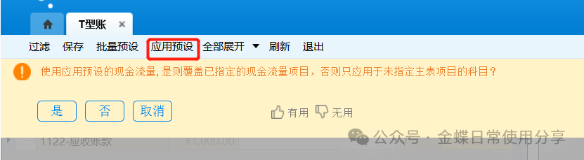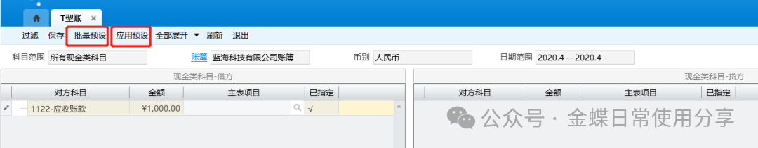 2.【T型账】提供【批量预设】、【应用预设】功能:点击【批量预设】调转到【项目批量预设】界面批量设置科目现金流入、现金流出时分别对应的主表项目,设置完成后,使用【应用预设】功能系统自动将对方科目预设的现金流入或流出时的主表项目默认携带;