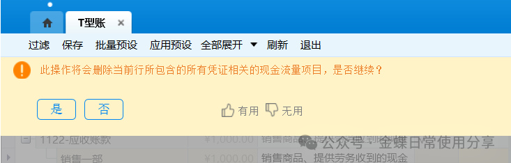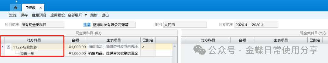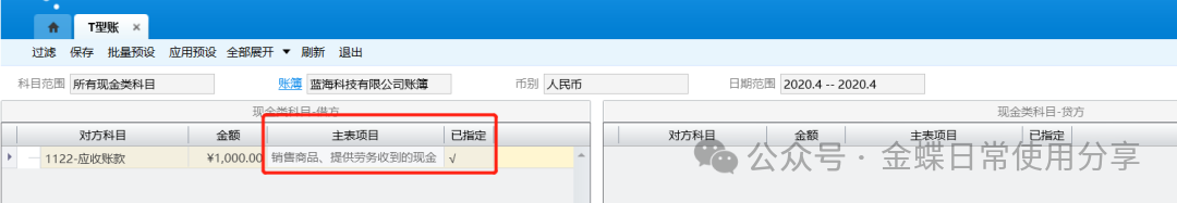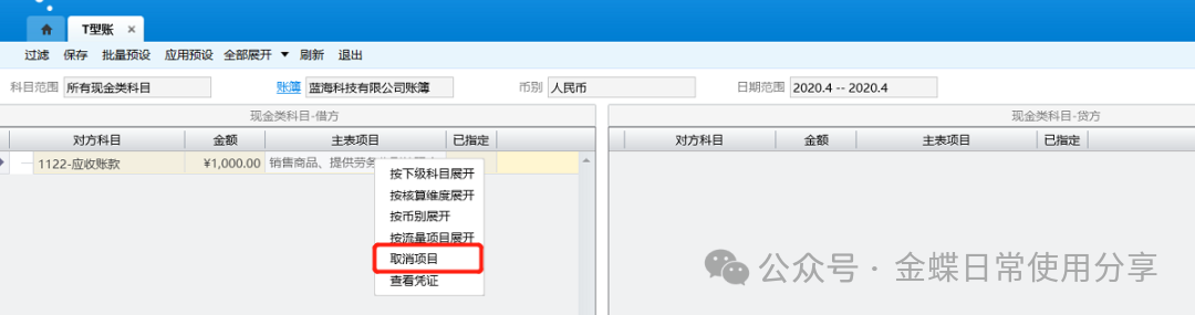 3.指定完成后,点击【保存】按钮,将已指定的信息保存到系统中,以便在现金流量表中查看; 4.用户可以点击右键在工具栏中对T型账两方的对方科目以核算维度、币别、下级明细科目或者现金流量项目等多种方式展开,联查凭证,方便指定和查阅;