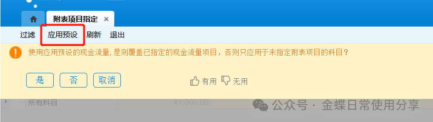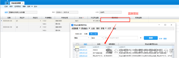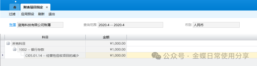 4.3附表项目指定【业务场景】:附表项目指定,是一种批量指定现金流量附表项目的方法,系统自动根据用户选定的凭证范围,将所有需要指定附表项目的凭证分录根据一定的规则拆分,用户可按下级科目、对方科目或者核算维度等不同的角度展开后批量指定现金流量附表项目。 【用户角色】:总账会计 【功能菜单】:【财务会计】->【总账】->【现金流量】->【附表项目指定】 【操作说明】: 1.由于包含现金类科目的凭证是否需要指定附表项目与主表项目的指定相关,所以建议通过T型账指定完主表项目后再使用附表项目指定;【附表项目指定】工具栏提供应用预设功能,该功能的前提是对方科目已经存在预设的附表项目信息,使用该功能系统自动将对方科目预设的附表项目默认携带;