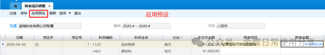 4.4附表项目调整【业务场景】:附表项目调整是指附表项目之间的调整,两个附表项目一个调增,一个调减,附表项目流量金额总额不变;附表项目调整是为了保证现金流量附表某些项目的金额与其它报表或科目余额表的相关项目的金额一致。 【用户角色】:总账会计 【功能菜单】:【财务会计】->【总账】->【现金流量】->【附表项目调整】 【操作说明】: 1.附表项目调整可采用直接指定和应用预设两个方式: (1)直接指定:进入到附表项目调整后,系统将会根据过滤条件中的期间范围和科目设置中的科目范围显示出需要进行附表项目调整的分录数据。这些分录数据均是已经被系统拆分为一借一贷的形式进行展现。在表格中,如果需要对这些数据进行现金流量项目的指定,请在对应的“附表项目”栏中,使用F8快捷键调出现金流量项目基础资料,然后进行附表流量项目的选择。在一一对应的借贷分录数据中,如果指定了其中一条分录数据的附表项目,就必须也对另一条进行指定,且需要保证指定的双方附表项目金额加总为0。这是为了保证现金流量表数据的正确平衡。指定完附表项目后,点击工具栏上的【保存】按钮后,附表项目调整的数据就被保存下来; (2)应用预设:如果在基础资料会计科目中,对科目进行的现金流量项目的预设,那么在附表项目调整中可以使用“应用预设”的功能。这样由系统自动将科目对应预设的现金流量项目进行批量指定。在应用预设的时候,同样需要保证指定的双方附表项目金额加总为0;
