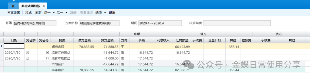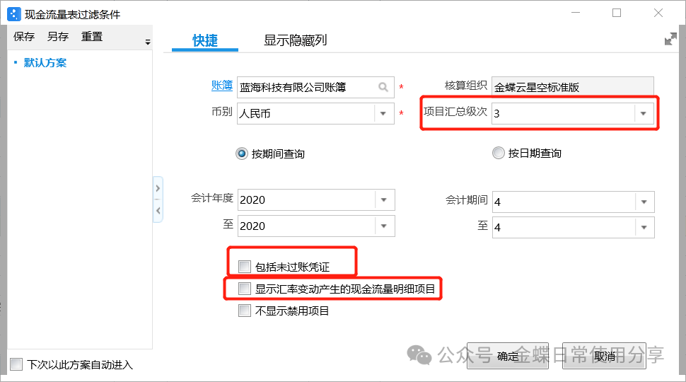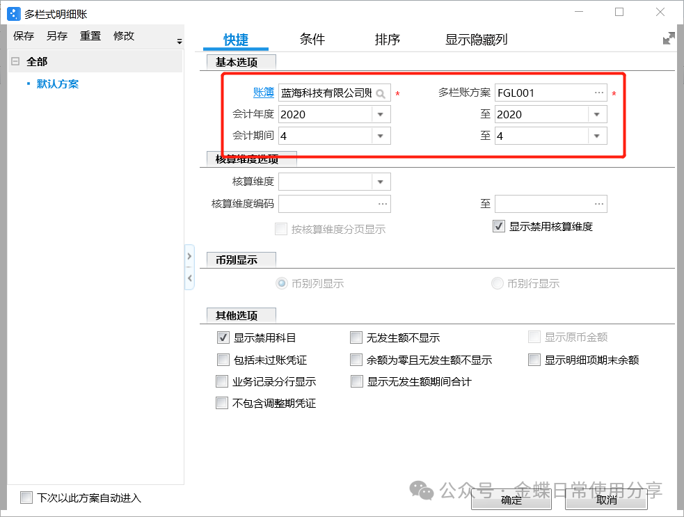 2.在过滤方案里,选择账簿、多栏式方案、会计年度、期间等信息进行查询;