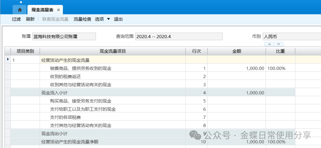 4.5现金流量表【业务场景】:系统根据已指定现金流量情况提供现金流量表查询;同时在现金流量表过滤结果界面增加“流量检查”按钮,用来调用现金流量检查功能。 【用户角色】:总账会计 【功能菜单】:【财务会计】->【总账】->【现金流量】->【现金流量表】 【操作说明】: 1.根据需要设置现金流量表的过滤方案,过滤条件说明如下; 项目汇总级次:设置现金流量明细项目的汇总级次,系统支持3级以上项目的汇总; 包括未过账凭证:选中此项,查询结果中包含未过账凭证的数据; 显示汇率变动产生的现金流量明细项目:选中此项,报表中将按照用户设置的项目汇总级次显示汇率变动产生的现金流量对应级次的项目明细;