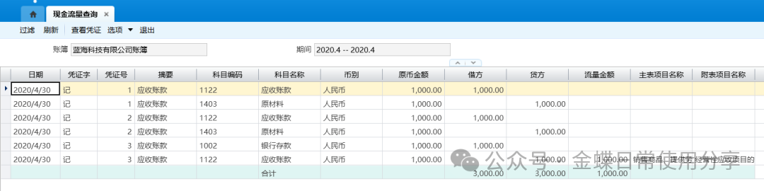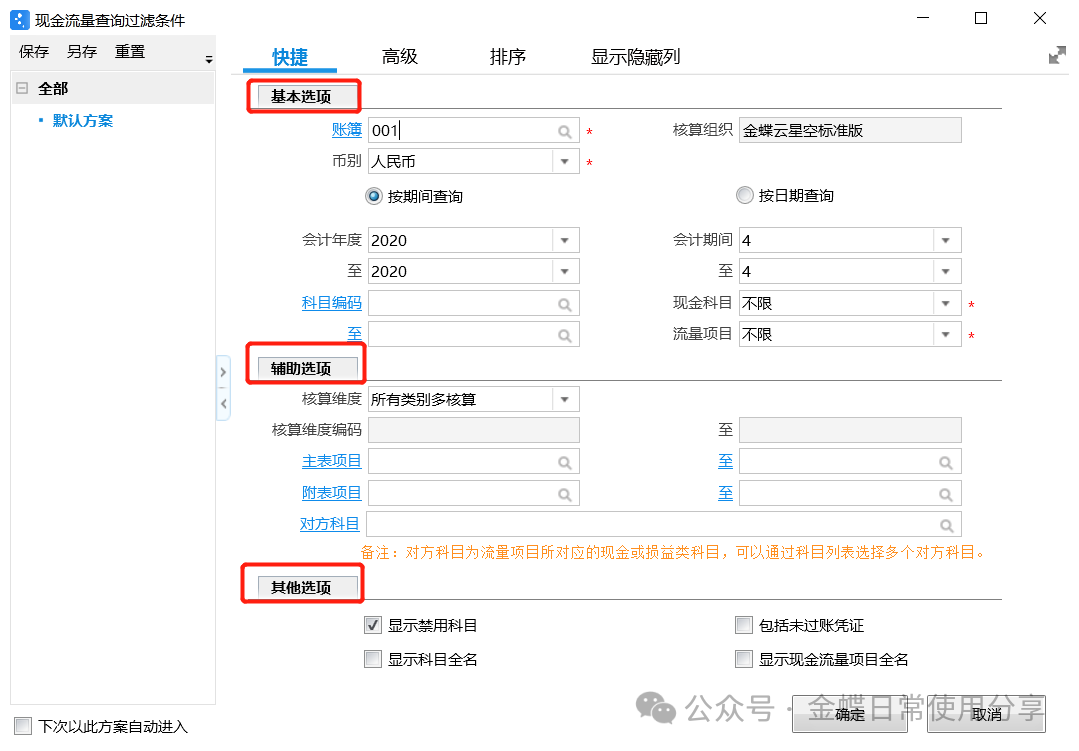 4.6现金流量查询【业务场景】:用户可通过现金流量查询来查询凭证的现金流量指定情况;现金流量查询支持按对方科目及凭证的制单人等字段过滤。 【用户角色】:总账会计 【功能菜单】:【财务会计】->【总账】->【现金流量】->【现金流量查询】 【操作说明】: 1.根据需要设置现金流量查询的过滤方案,过滤条件说明如下; 核算维度相关选项:用户可以设置凭证关联的核算维度条件,缩小查询范围; 现金科目:设置凭证是否包含现金类科目; 流量项目:设置凭证是否已指定现金流量项目; 主表项目、附表项目:设置特定查询的主表项目或附表项目; 包括未过账凭证:选中此项,查询结果包含符合过滤条件的未过账凭证的数据;