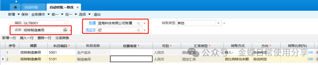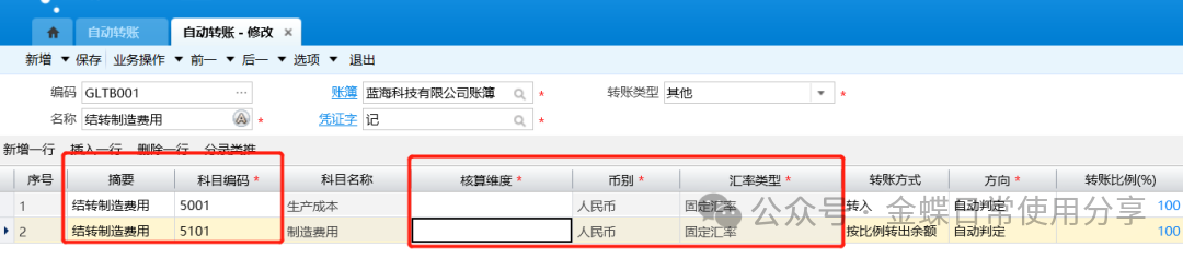 2.录入摘要、科目编码、核算维度、币别、汇率类型: (1)设置参与转账的科目,如果是按公式转入或转出,只能设置明细科目; (2)如果是转出科目且携带核算维度,用户可以不设置核算维度,表示转出所有核算维度,也可以设置转出核算维度的范围; (3)转出和转入科目的科目编码结构以及核算维度相同时,可以不用在模板中指定核算维度,系统可以实现一一对应结转; (4)如果是转入科目,用户设置核算维度,表示指定转入到该科目的具体核算维度中。如果是按公式转入或转出,科目的核算维度又是必录的话,必须指定明细核算维度; (5)如果转出科目和转入科目的币别不同,系统根据对应汇率关系进行换算。如果是本位币转入转出,汇率类型不需设置;