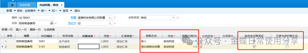 3.设置转账方式、方向、转账比例等信息: (1)设置科目转账的方式,可以转出本期发生额或余额。其他数据类型或者多个期间的转账需要使用公式转入或转出; (2)“方向”用于设置生成转账凭证分录的方向。如果选择自动判定,则借贷方科目的方向都需要设置为自动判定,非公式转入转出时,可以设置为自动判定;按公式转入转出,需要选择借方或贷方; (3)有多个转入科目时,合计比例应该为100%,如果超出100%,生成凭证借贷无法平衡; (4)当转账方式是按公式转账时,公式方法默认为报表取数,不可编辑。当公式方法为报表取数时,公式定义才允许编辑,调用报表取数公式设置转账公式; (5)勾选“包含未过账凭证”时,转账取数包含未过账凭证的相关金额; (6)勾选“不参与多栏账汇总”时,转账生成的对应分录不参与多栏账明细分栏的合计;