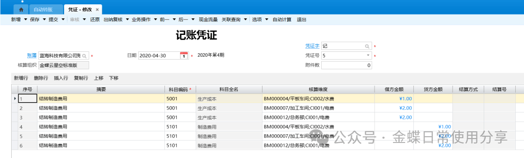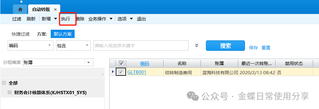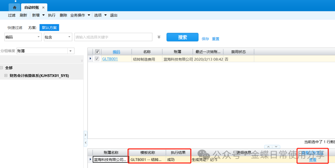 4.每期期末,勾选相应的自动转账方案,点击工具栏【执行】即可生成相应凭证;