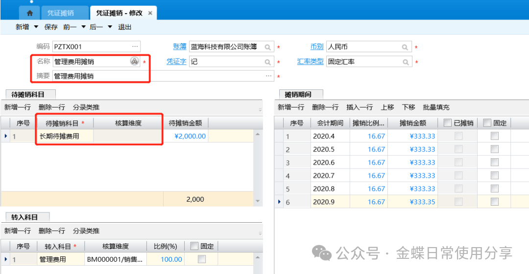 3.选择转入的科目(为方案生成凭证的借方科目),并指定转入科目的核算维度值。 生成凭证的借方科目的原币金额=该期的摊销金额*比例。比例合计应为100%;