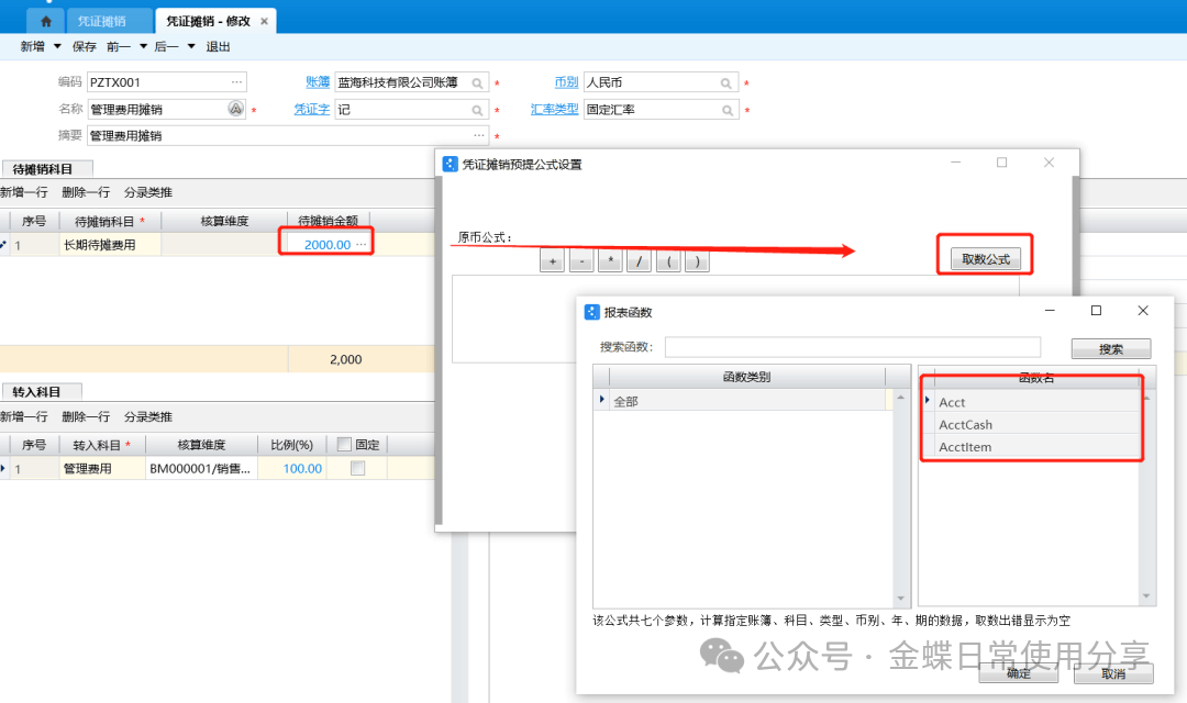 2.设置待摊销的金额,可以手工设置,也可以双击通过公式来设置。公式设置中可以用报表函数取数,也支持加、减、乘、除的运算;