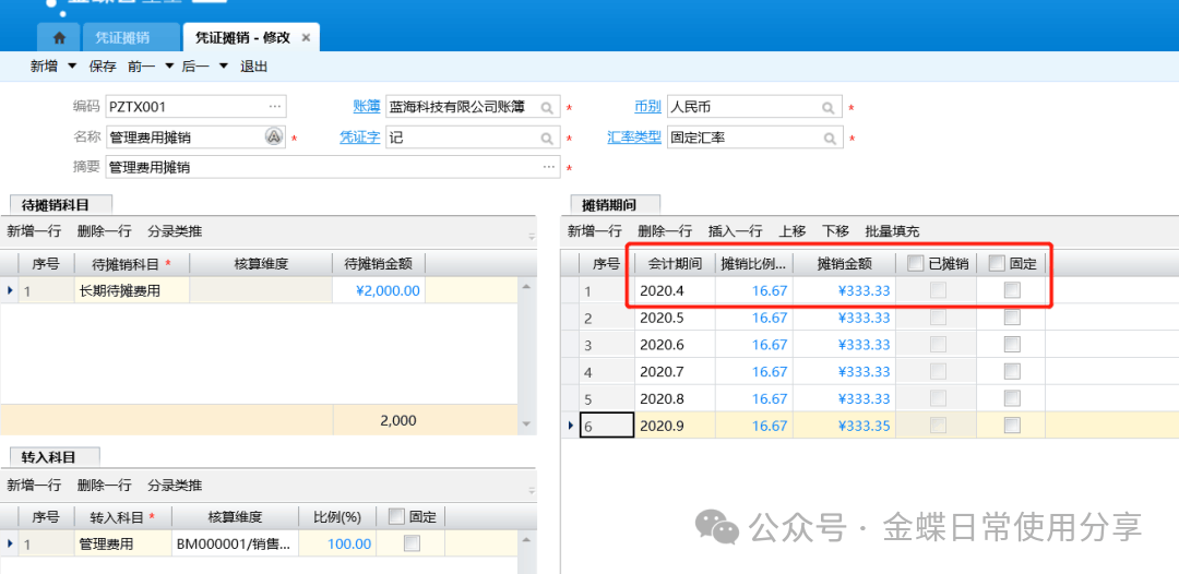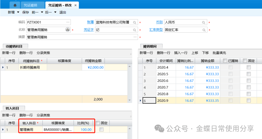 4.选择生成摊销凭证的会计期间,录入各期间的摊销比例,方便计算摊销金额。比例合计应为100%。根据待摊销总额*摊销比例自动计算,也可以手工修改,修改后会反算摊销比例。该期若已生成凭证则系统自动勾选“已摊销”,未勾选“固定”的分录行的比例根据行数自动平均;