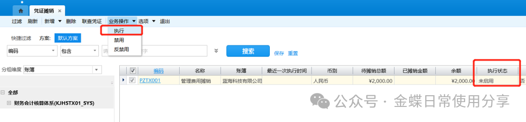 5.每期期末,勾选相应的凭证摊销方案,点击工具栏【执行】即可生成相应凭证;第一次保存的摊销方案的执行状态为“未启用”;