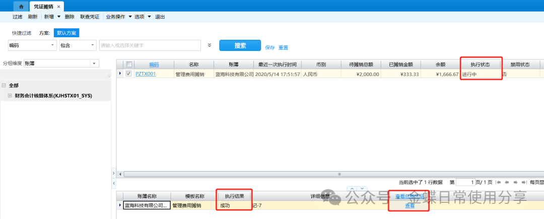 6.当执行摊销方案后,摊销方案处于“进行中”的状态,系统提示成功生成总账凭证,点击【查看】按钮,可查看相应信息;该摊销期间在摊销方案中系统会自动勾选“已摊销”;