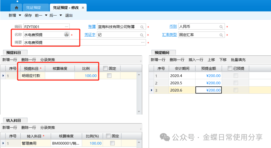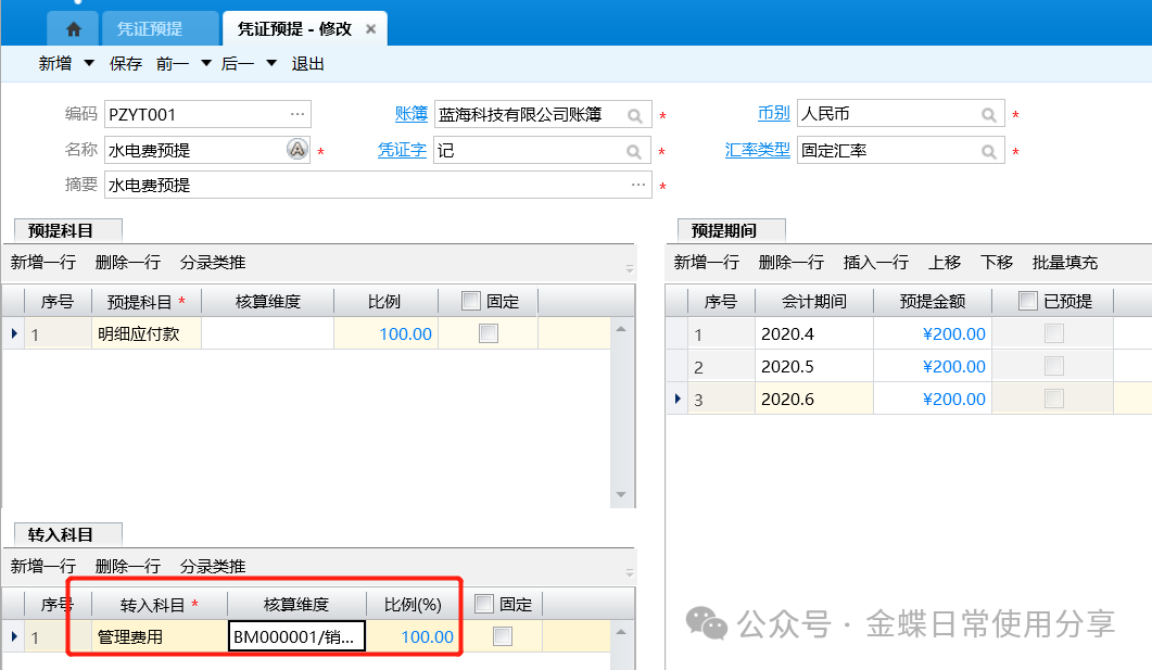 2.选择转入的科目(方案生成凭证的借方科目),指定转入科目的核算维度值,生成凭证的借方科目的原币金额=该期的预提金额*比例。比例合计应为100%