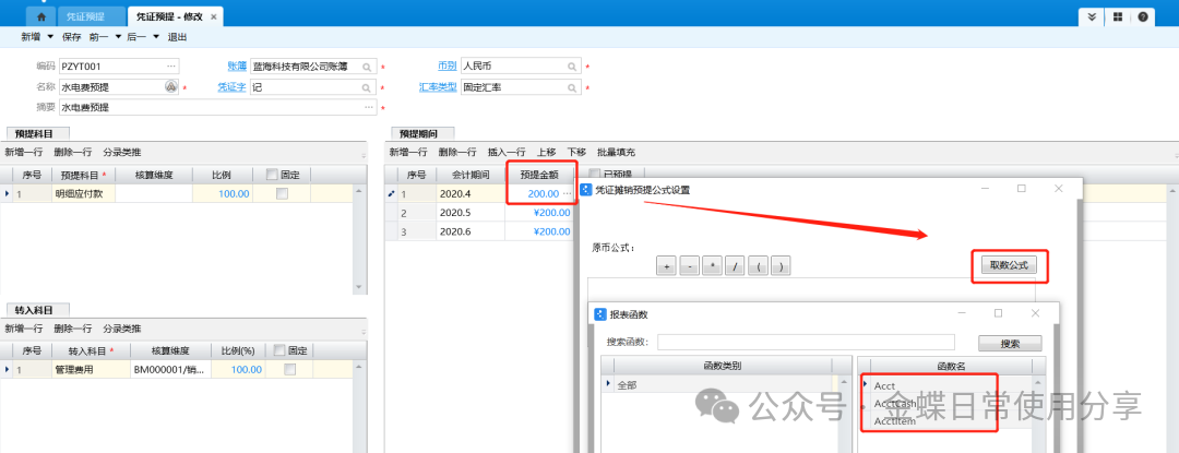 3.选择生成凭证的会计期间,设置待预提的金额,可以手工设置,也可以双击通过公式来设置。公式设置中可以用报表函数取数,也支持加、减、乘、除的运算;