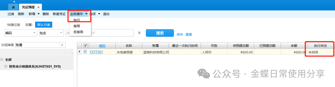 4.每期期末,勾选相应的凭证预提方案,点击工具栏【执行】即可生成相应凭证;第一次保存的预提方案的执行状态为“未启用”;