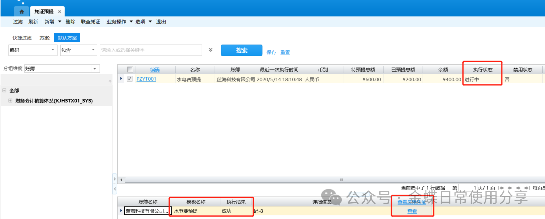 5.当执行预提方案后,预提方案处于“进行中”的状态,系统提示成功生成总账凭证,点击【查看】按钮,可查看相应信息;该预提期间在摊销方案中系统会自动勾选“已预提”;