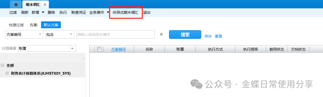 6.未勾选“固定”的分录行的比例根据行数自动平均; 7.该期若已生成凭证则系统自动勾选“已预提”; 8.状态 :已预提金额为零,则方案状态为未启用;已预提金额不为零且余额不为零,则方案状态为进行中;余额为零则方案状态为关闭; 9.修改:凭证预提方案如果某些期间勾选了“已预提”标识,则这些期间的预提金额则不允许编辑; 10.删除:已经生成凭证的凭证预提方案不允许删除; 11.执行:用户可以选择一个或多个凭证预提方案执行,一个凭证预提方案生成一张凭证;同一个凭证预提方案在一个会计期间内只允许生成一张预提凭证; 12.联查凭证:用户选择一个或多个凭证预提方案后点击【联查凭证】按钮,系统将展示这些方案生成的凭证列表; 5.4期末调汇【业务场景】:期末调汇主要用于对账簿内外币核算的科目在期末自动计算汇兑损益,生成汇兑损益结转凭证。期末调汇必须满足下列条件才能执行调汇操作: 1) 账簿已经结束初始化; 2) 币别基础资料中已启用外币; 3) 账簿科目表中存在已启用期末调汇的科目。 【用户角色】:总账会计 【功能菜单】:【财务会计】->【总账】->【期末处理】->【期末调汇】 【操作说明】: 1.点击【向导式期末调汇】按钮:选择调汇的账簿,点击【下一步】;