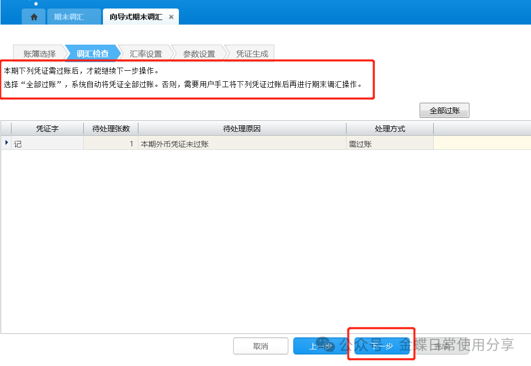 2.调汇检查:若存在未过账外币凭证,在调汇检查时会提示,需点击【全部过账】将外币凭证进行过账后,再点击【下一步】;