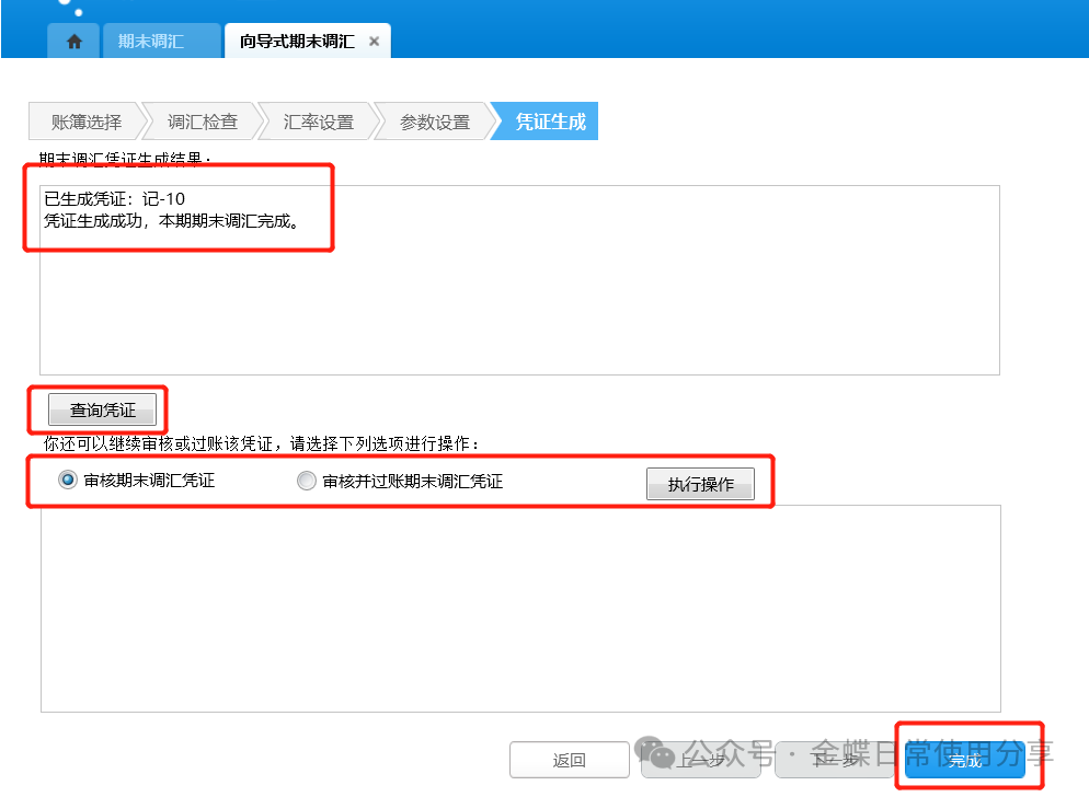 5.点击【下一步】后,系统将自动生成期末调汇记账凭证,显示期末调汇凭证生成结果,可查询凭证,同时还可选择是否对调汇凭证进行审核、过账操作,确定后点击【完成】;