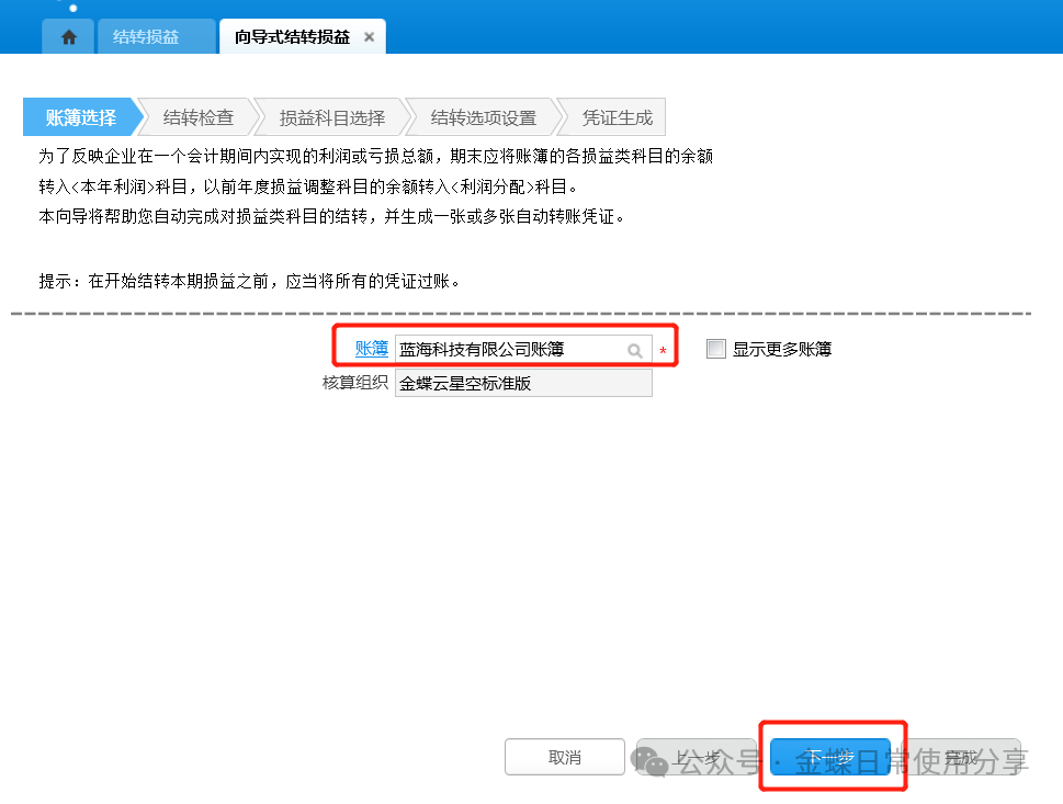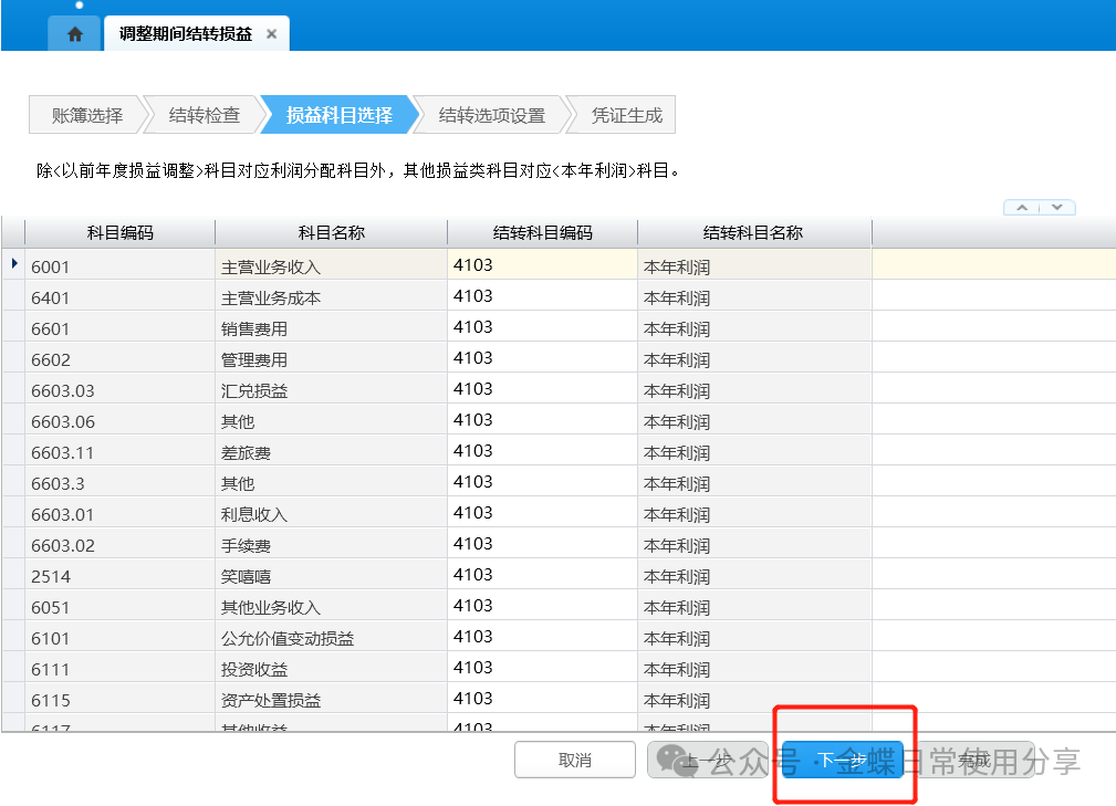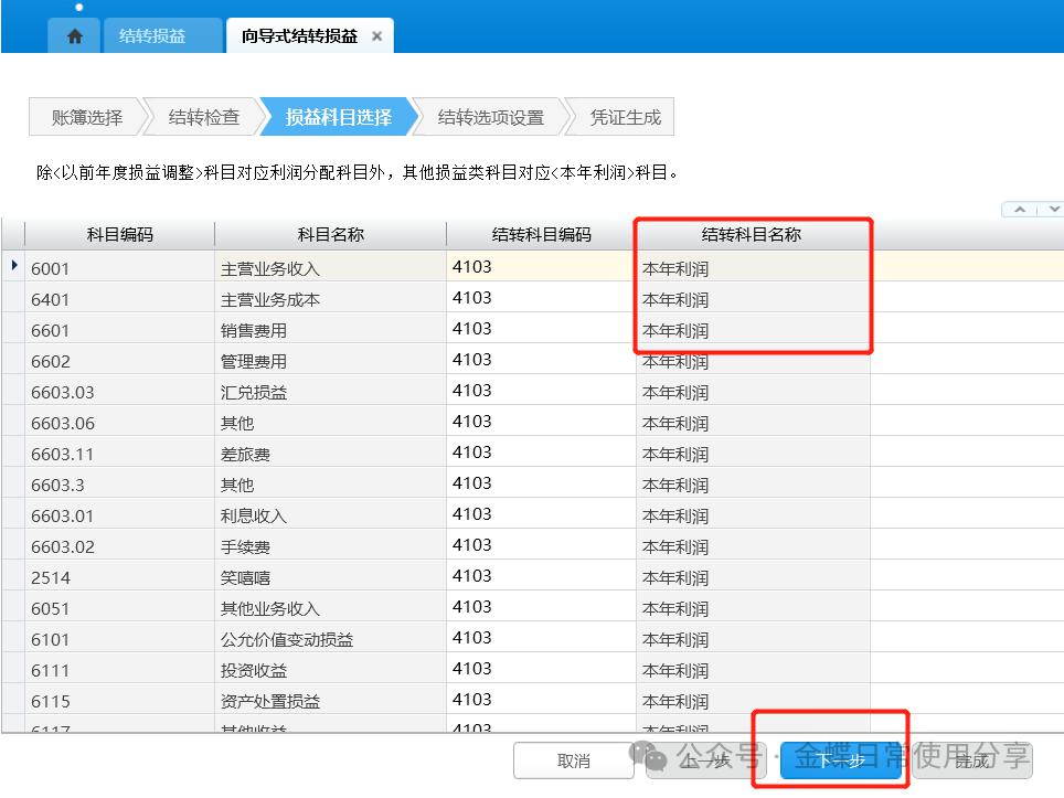 2.损益科目选择:损益科目已在账簿系统参数中设置,此处直接引用;确认结转科目无误后,点击“下一步”;