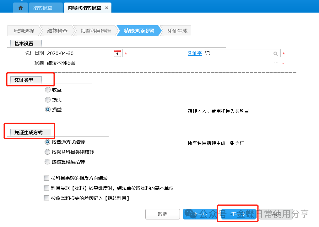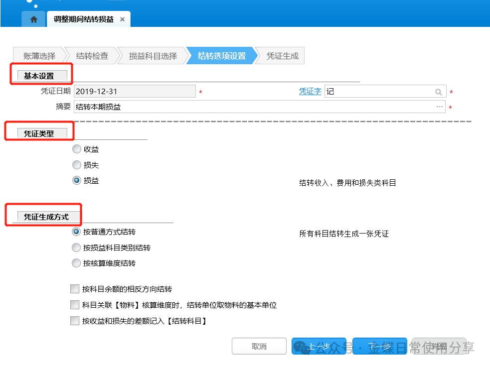3.设置凭证类型、凭证生成方式: (1)凭证类型如果选择“收益”,系统将收入类科目结转生成一张凭证;选择“损失”,系统将费用、损失类科目结转生成一张凭证;选择“损益”,系统将收入、费用和损失类科目结转生成一张凭证; (2)凭证生成方式若选择“按科目余额的相反方向结转”,结转凭证分录的余额如果为负数,则将其余额置为相反方向的正数。不勾选时,系统始终结转至科目余额所在方向; (3)若选择“按普通方式结转”,系统将所有结转科目生成到一张凭证中; (4)若选择“按损益科目类别结转”,系统将损益类科目按其类型分别生成多张结转损益凭证。如营业收入、期间费用、其他损失等; (5)若选择“按核算维度结转”,系统将按照损益类科目所挂的核算维度分别生成多张凭证。首先将相同核算维度的损益类科目按核算维度分别生成不同的凭证,然后将剩余的没有带此核算维度的科目结转生成另外一张凭证,最后将不带任何核算维度的科目结转生成一张凭证;