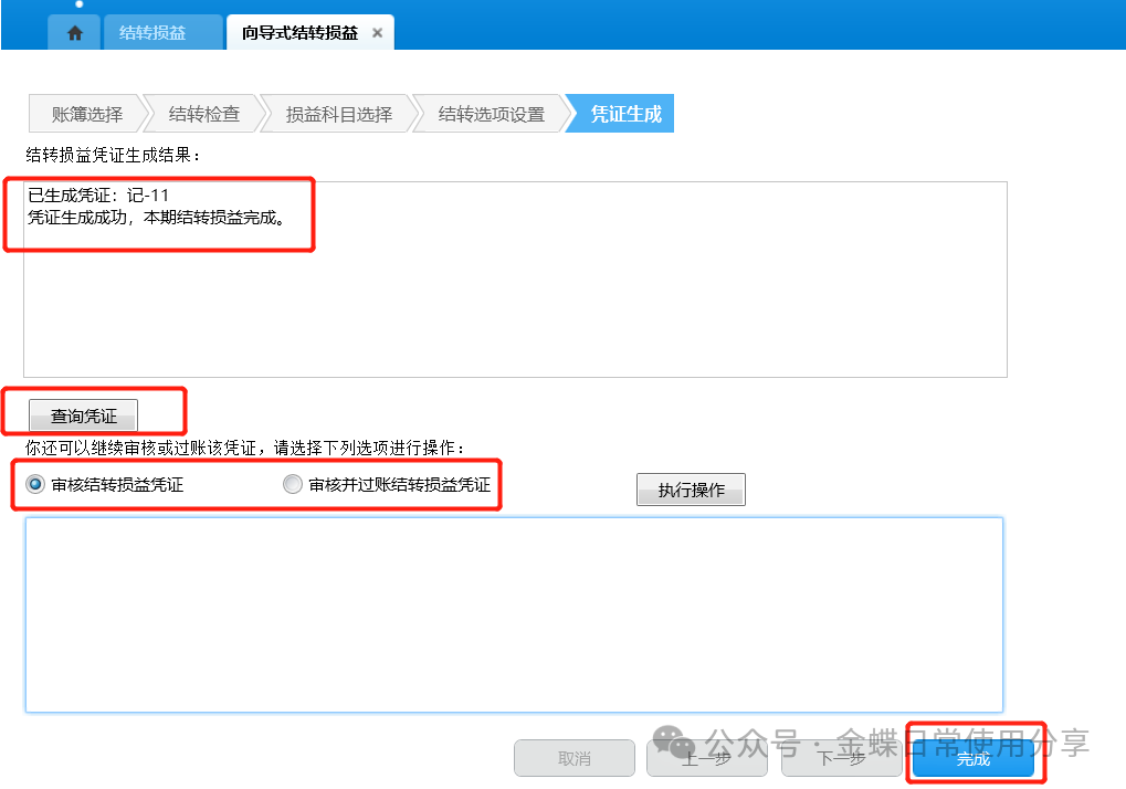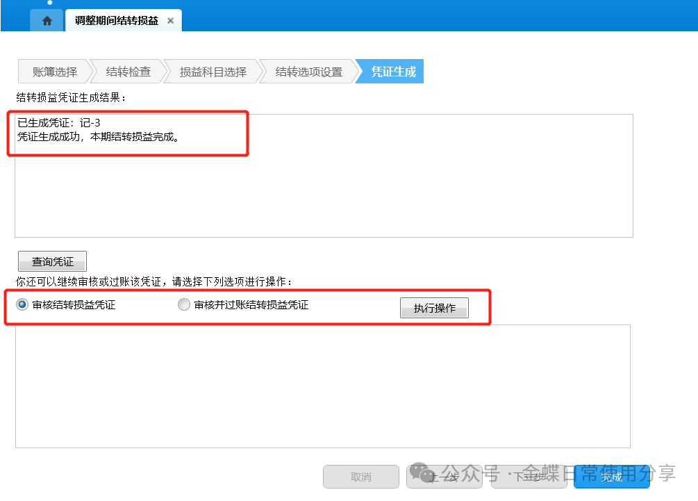 1.点击【下一步】后,系统将自动生成结转损益记账凭证,显示本期结转损益生成结果,可查询凭证,同时还可选择是否对损益凭证进行审核、过账操作,确定后点击【完成】;
