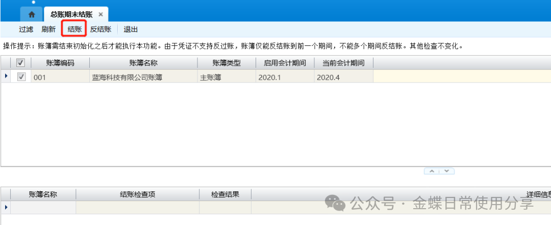 5.6总账期末结账【业务场景】:在账簿本期所有的会计业务全部处理完毕之后,就可以进行期末结账了。系统的数据处理都是针对于账簿的当前会计期间,要进行下一个会计期间的处理,必须将本期的账务全部进行结账处理,系统才能进入下一个会计期间。 结账之前,按企业财务管理和成本核算的要求,必须进行制造费用、产品生产成本的结转,期末调汇及损益结转等工作。 【用户角色】:总账会计 【功能菜单】:【财务会计】->【总账】->【期末处理】->【总账期末结账】 【操作说明】: 1.选择所需结账的账簿,点击【结账】按钮,检查通过后,系统对相关账簿执行结帐操作,并显示结账报告;