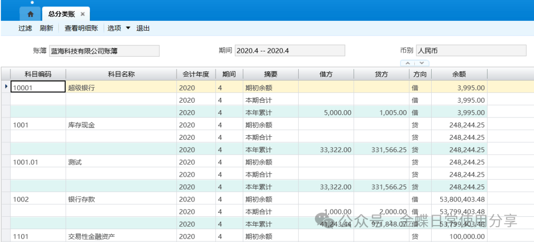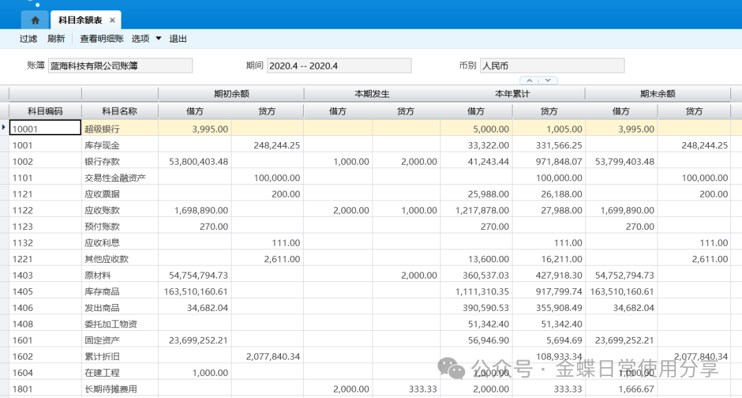 7财务报表查询7.1科目余额表【业务场景】:科目余额表是以报表形式显示各个科目的年初余额、期初余额 、本期发生额、本年累计、以及期末余额。资产负债表可以根据科目余额表编制,科目余额表里面的科目余额应当等于资产负债表科目余额。 账表设置的科目数据范围,支持按账簿的核算组织进行隔离。 系统支持科目余额表联查明细分类账,用户选择需要联查的记录,点击工具栏的查看明细账按钮联查明细分类账信息。 【用户角色】:总账会计 【功能菜单】:【财务会计】->【总账】->【财务报表】->【科目余额表】 【操作说明】:查询科目余额表