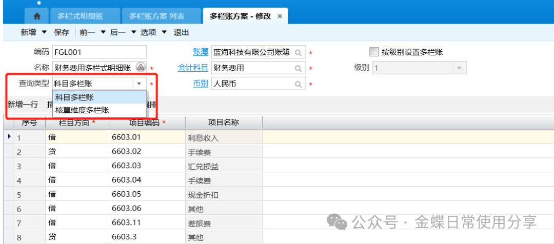 6.4多栏式明细账【业务场景】:系统提供科目以及核算维度的多栏式明细账查询,多栏式明细账可以适用于:物资采购明细分类核算、生产成本明细分类核算以及费用项目明细分类核算等查询。 【用户角色】:总账会计 【功能菜单】:【财务会计】->【总账】->【账簿】->【多栏式明细账】 【操作说明】: 1.用户第一次进入多栏式明细账需新增“多栏式方案”,可根据实际情况设置多栏式明细账的格式,包括账簿、查询类型以及查询项目等;