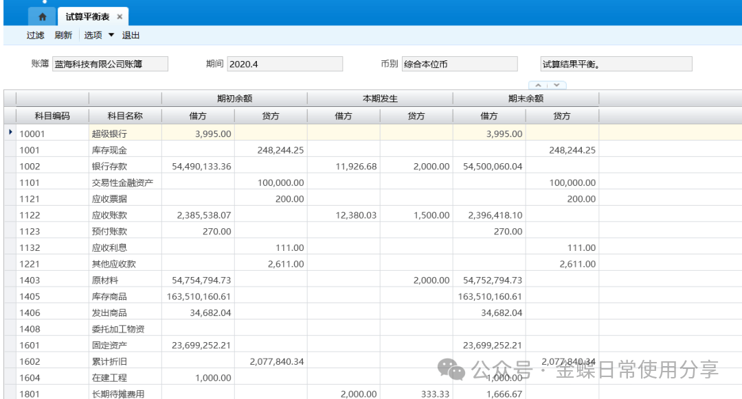 7.2试算平衡表【业务场景】:试算平衡表,用于输出和查询所选期间的各科目的期初余额、本期发生额及期末余额数据。用户可以查询账簿内不同的会计期间以及不同币别的试算平衡表数据。 【用户角色】:总账会计 【功能菜单】:【财务会计】->【总账】->【财务报表】->【试算平衡表】 【操作说明】:查询试算平衡表
