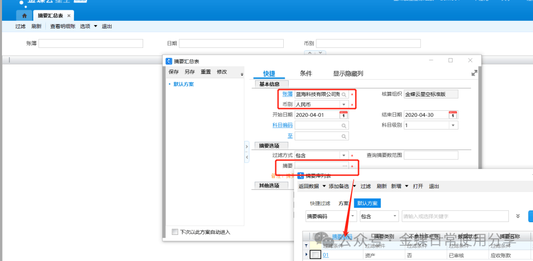 7.3摘要汇总表【业务场景】:总账系统提供摘要汇总表查询功能,摘要汇总表可按凭证摘要过滤后汇总查询账簿一定期间内科目发生金额,便于查询某项特定业务在指定期间的发生情况。 【用户角色】:总账会计 【功能菜单】:【财务会计】->【总账】->【财务报表】->【摘要汇总表】 【操作说明】: 1.在摘要汇总表过滤条件界面中选择需要查询的账簿,设置会计年度期间以及摘要信息等基本过滤条件;