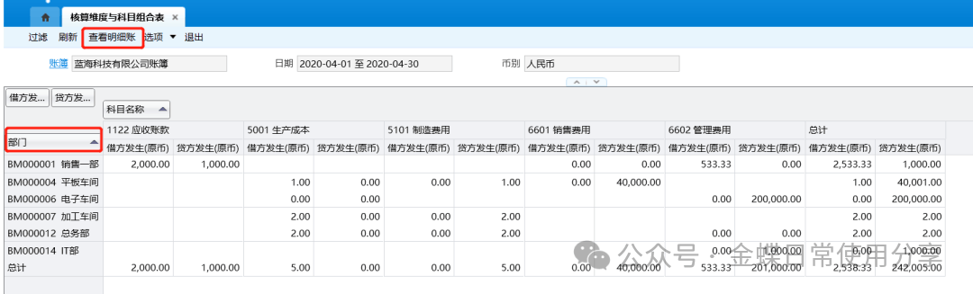 7.5核算维度与科目组合表【业务场景】:核算维度与科目组合表提供了核算维度与会计科目二维组合报表,既可以反映指定类别的核算维度所涉及的所有或多个会计科目的发生额及期初期末余额,又可以反映指定会计科目对应的所有或多个核算维度发生情况及余额。 【用户角色】:总账会计 【功能菜单】:【财务会计】->【总账】->【财务报表】->【核算维度与科目组合表】 【操作说明】:查询核算维度与科目组合表