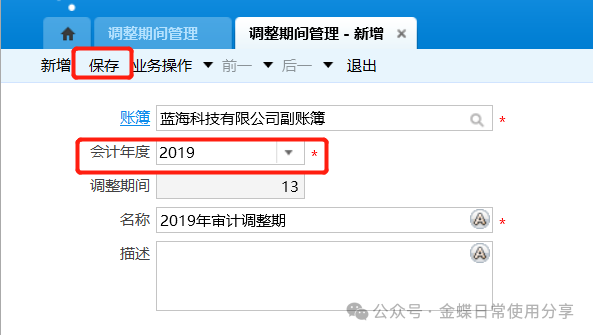 8调整期间业务处理8.1调整期间管理【业务场景】:调整期间管理用来维护各账簿的调整期间,支持调整期间的新增、复制、修改、删除、打开、关闭等操作。 【用户角色】:总账会计 【功能菜单】:【财务会计】->【总账】->【调整期间业务处理】->【调整期间管理】【操作说明】: 1.点击【新增】按钮,选择相应的账簿和会计年度,点击【保存】按钮;调整期间的名称的默认值为“[会计年度]年审计调整期”;