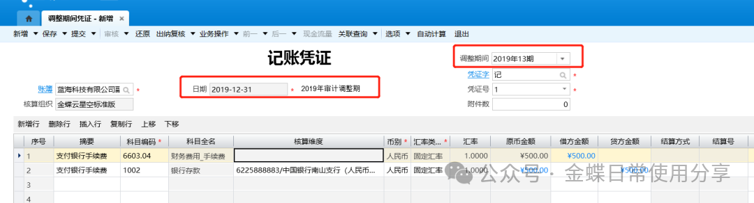 3.调整期间不提供提交和审核控制,保存后,允许用户关闭或打开调整期间; 4.用户点击调整期间字段值时,调用“调整期间 - 修改”界面,只允许修改名称和描述; 5.每个账簿调整期间的删除,只能从最后一个期间往前删除,不允许从开始或中间的期间删除。已经录入的调整期间,如果已经存在对应的调整期凭证则不允许删除,系统提示:“调整期间[调整期间号]已发生业务,不能删除,请删除该调整期间的凭证后再删除!”; 6.调整期间的 “关闭”要检查相应调整期间的凭证是否都已经过账,如果还存在未过账调整凭证,则不允许关闭并提示用户:“调整期间[2019年13期]存在未过账凭证,请先将凭证过账后再关闭!”,关闭后的调整期间不能再录入凭证和进行凭证过账。调整期间的状态不影响调整期报表的查询; 7.对调整期间的新增、修改、删除、打开和关闭等操作都会在上机操作日志中进行记录; 8.2调整期间凭证录入【业务场景】:调整期业务处理,是在不反结账的情况下,直接对上一年度增加调整期间并录入调整分录,调整期间的凭证过账后,直接更新下一年度各期间的科目余额。 【用户角色】:总账会计 【功能菜单】:【财务会计】->【总账】->【调整期间业务处理】->【调整期间凭证录入】 【操作说明】: 1.和普通凭证录入实现一致,标题显示“调整期间凭证录入”,在日期下面增加“调整期间”下拉列表,用来选择要录入凭证的调整期间。凭证信息录入完毕且无误后,点击【保存】、【提交】、【审核】;