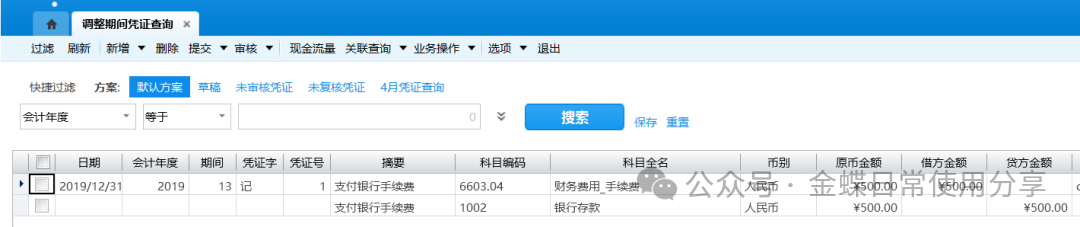 2.调整期间下拉列表显示当前账簿所有“打开”状态的调整期间(格式为:[会计年度]年[调整期间]期,如:“2019年13期”),只有为非“关闭”状态的调整期间才在下拉列表显示并允许录入调整凭证; 3.调整凭证的日期默认为调整期间所在会计年度的会计日历的最后一天,且不允许修改,选择调整期间后在日期后面显示调整期间的名称; 8.3调整期间凭证查询【业务场景】:用户可通过“调整期间凭证查询”功能查询调整期间凭证。 【用户角色】:总账会计 【功能菜单】:【财务会计】->【总账】->【调整期间业务处理】->【调整期间凭证查询】 【操作说明】: 1.用户可通过“调整期间凭证查询”功能查询调整期间凭证;