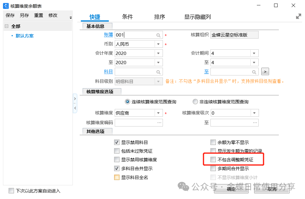 3.在报表查询过滤界面,若勾选选项中的“不包含调整期凭证”,则查询报表所在期间范围内的调整期凭证均不显示;若不勾选,则期初包含上一年度调整期凭证,期间范围内的本年度调整期凭证也包含在内;
