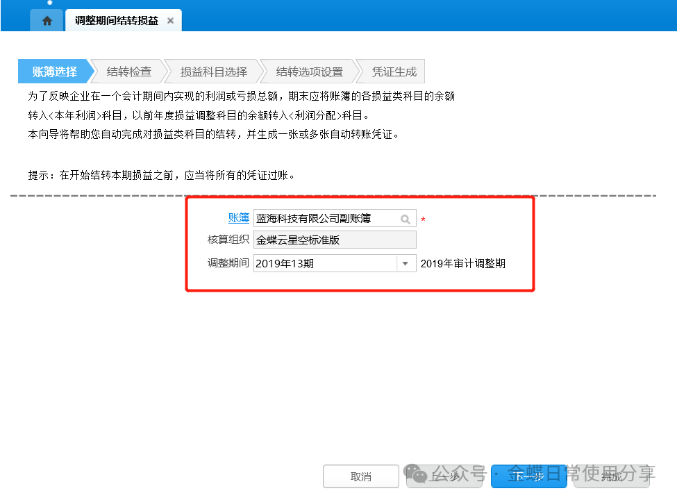 8.6调整期间结转损益【业务场景】:用户可通过“调整期间结转损益”功能进行调整期业务的结转损益处理。 【用户角色】:总账会计 【功能菜单】:【财务会计】->【总账】->【调整期间业务处理】->【调整期间结转损益】 【操作说明】: 1.账簿选择:选择账簿、调整期间,点击【下一步】,结转损益界面的调整期间下拉列表显示账簿在当前会计期间之前所有未关闭的调整期间;