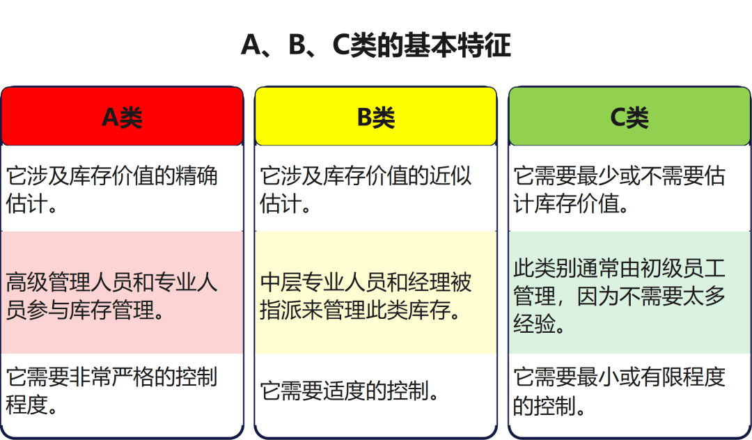 ![]() 这种出库方式很适合医药、化工、食品行业,当出现质量问题,批次追溯就很关键。 7. 按ABC分类 ABC Picking ABC Picking 是基于ABC分类法的拣货策略,按物品的重要性或价值将库存分成三类: