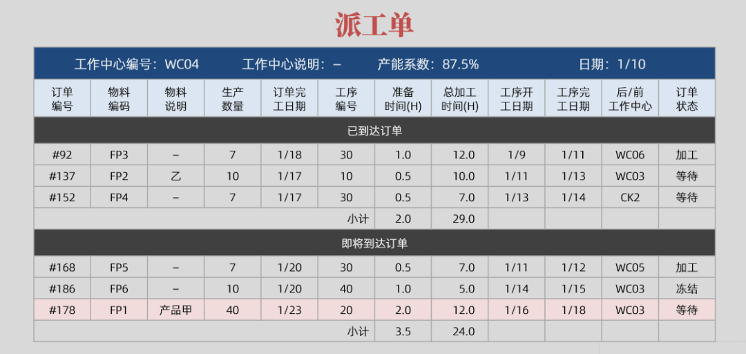 车间排产之后,接下来是要解决产能问题,也就是要制订好能力计划,确保排产结果是可执行的。通过产能管理,如果发现产能不足,就要提前采取措施解决掉,而不是事到临头再干着急。如果有产能剩余,同样要想办法解决,以便充分利用车间产能。 在解决了产能问题之后,还有一个问题要解决,就是生产优先级。现在的生产设备很多是通用的,很多生产订单会经过同一个工作中心。生产工人完成一份生产订单之后,接下来处理哪份订单呢?这就要管理好生产优先级,否则容易导致有的生产订单进度超前,而有的生产订单进度落后。所以在车间管理方面,管理好生产优先级非常重要。 ERP系统是怎样帮企业管理生产优先级的呢?解决方案就是派工单。派工单是基于车间排产结果生成的。有了派工单,生产工人就可以明确地知道,应该先生产什么,后生产什么,同时还可以通过派工单来控制生产进度。 下面是一份派工单的典型格式,你可以细细琢磨一下。