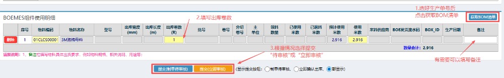 4.选好单号后,按照图中进行操作:先点击右边的“获取BOM清单”,填写“出库卷数”,然后根据情况选择“提交制单待审核”或“提交立即审核”。