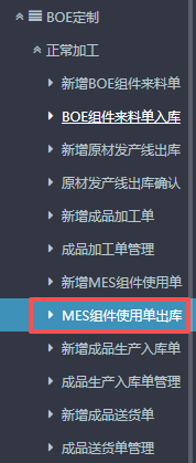 :点晴ERP-BOE关于MES组件使用单流程![]() 1.进入ERP系统之后,在左侧功能菜单里找到“BOE定制”,点开后点击“正常加工”,找到“新增MES组件使用单”。