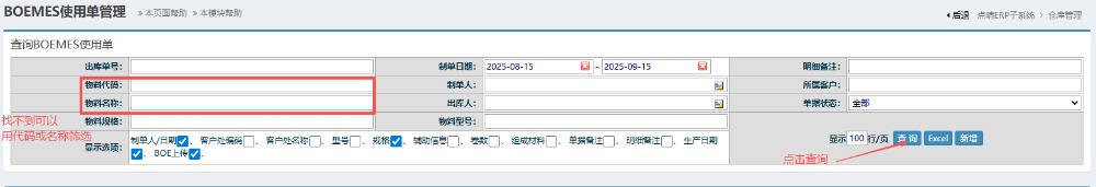 6.点击打开后,点击查询。如果没有找到单子可以填编码或者名称筛选。 7.查询之后,按图操作:先点击对应使用单进行确认,然后再进行上传BOE。 如果确认后发现有其他问题或者需要修改的话,可以点击对应使用单,点击“编辑”,然后驳回。重新按照上述流程操作。