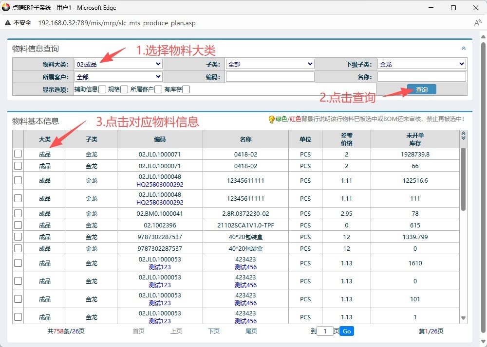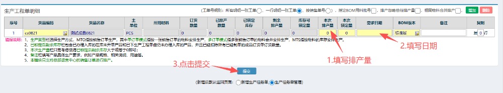 4.选好物料后,按图操作:填写排产量,填写日期,然后点击提交。